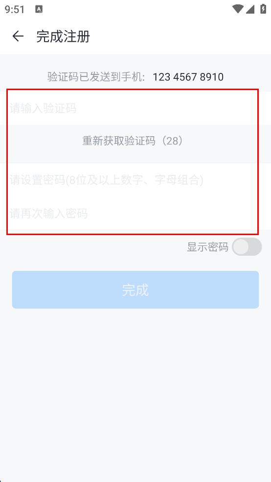 4、在完成注冊頁面,輸入驗證碼,設(shè)置并再次輸入密碼,點(diǎn)擊完成即可完成注冊。