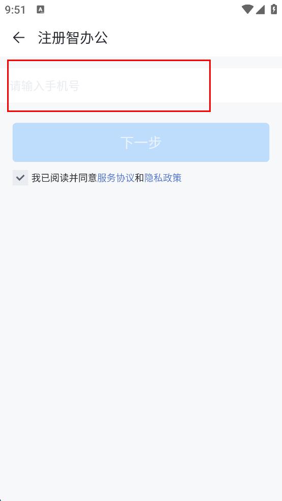3、在注冊智辦公頁面,輸入手機(jī)號,勾選已閱讀并同意相關(guān)協(xié)議,點(diǎn)擊下一步,進(jìn)入完成注冊頁面。