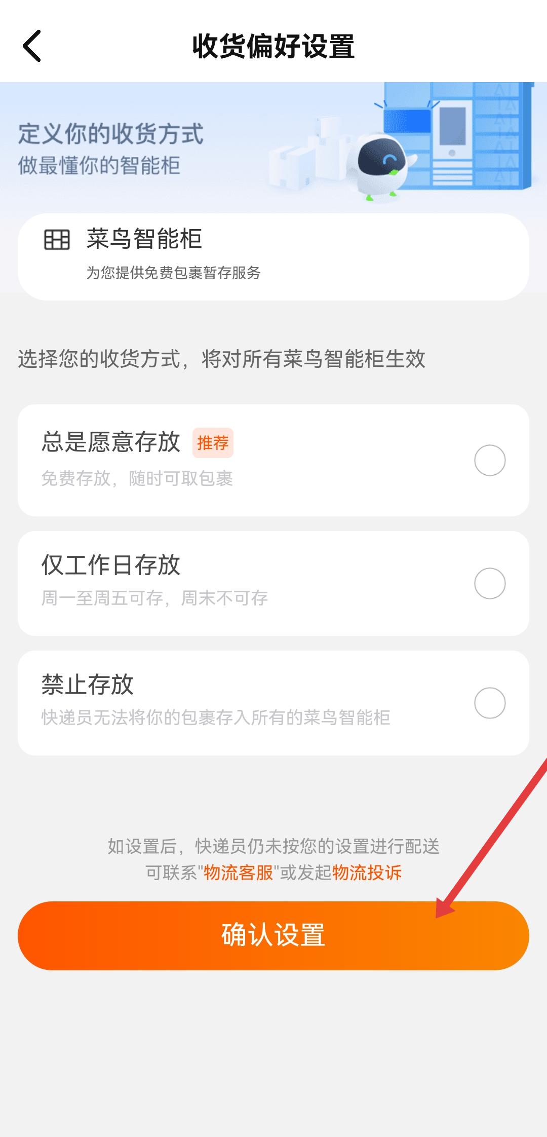 3、在收貨偏好設置頁面,選擇對應的收貨方式如總是愿意存放、僅工作日存放或禁止存放,選好后點擊確認設置按鈕。