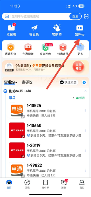 1、打開菜鳥裹裹APP,點擊出庫碼選項進入出庫碼頁面。