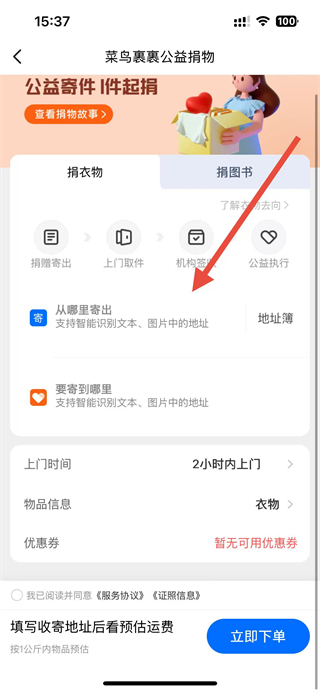 3、在頁面填寫寄件地址、收件地址,選擇上門時間等信息,勾選協(xié)議后,點擊立即下單即可。