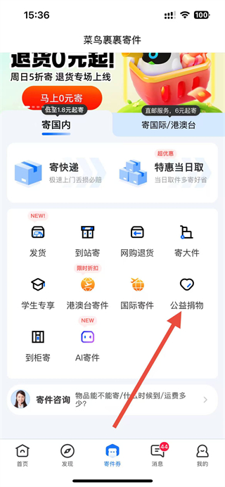 2、在當前頁面中,找到并點擊公益捐物選項,進入菜鳥裹裹公益捐物界面。
