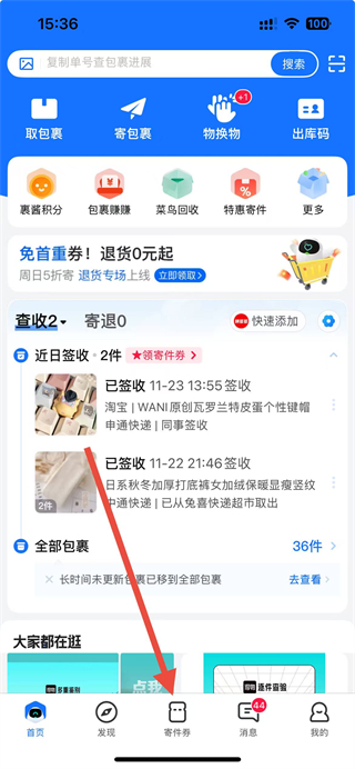 1、進入菜鳥主界面后,點擊底部導航欄的寄件券選項,進入寄件相關(guān)頁面。