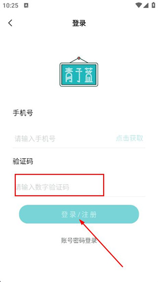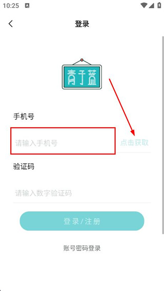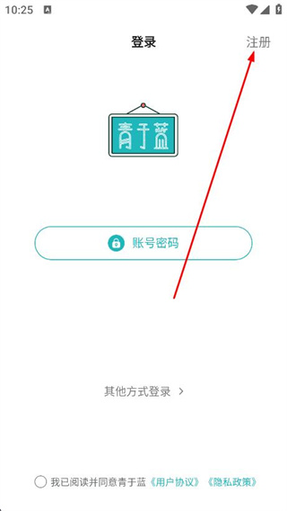 1、打開青于藍(lán)app,在登錄頁面,找到并點(diǎn)擊右上角的注冊(cè)選項(xiàng)。