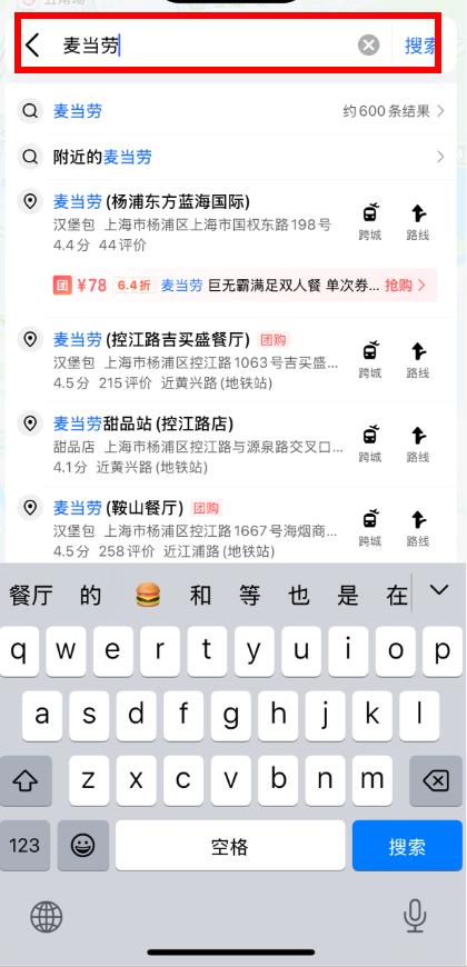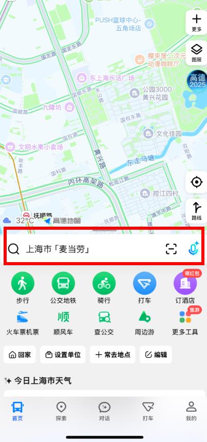 1、打開高德地圖APP,在首頁頂部搜索欄中,輸入要搜索的店鋪名稱,如上海市麥當勞。