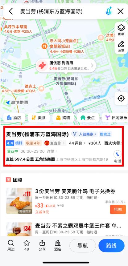 3、在搜索結果列表中,點擊想要查看的店鋪,如麥當勞楊浦東方藍海國際,即可進入該店鋪詳情頁,查看店鋪評分、營業(yè)時間、地址等信息。