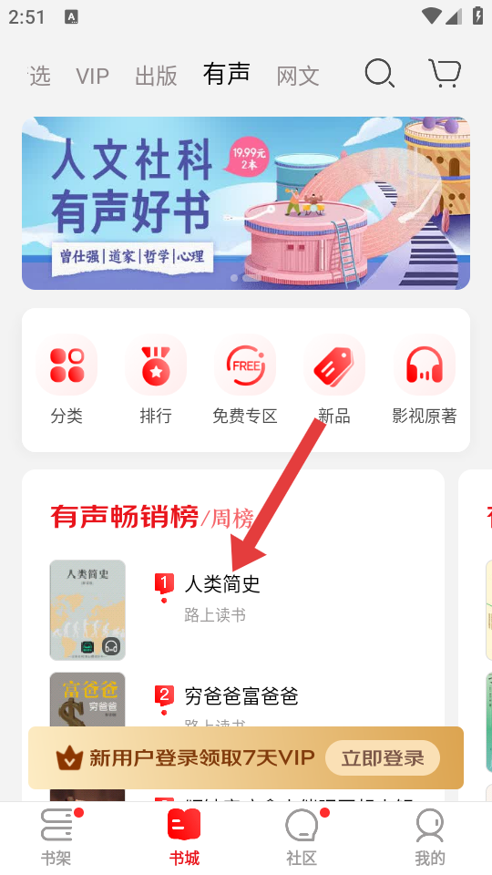 1、打開京東讀書APP,進(jìn)入書城頁面,點擊頂部有聲分類,找到想要聽的書籍,點擊進(jìn)入書籍詳情頁。