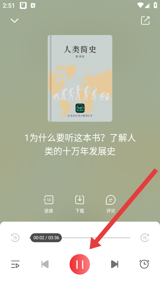 3、進(jìn)入播放界面后,即可開始聽書,還可以在界面中隨時點擊暫停,享受聽書體驗。