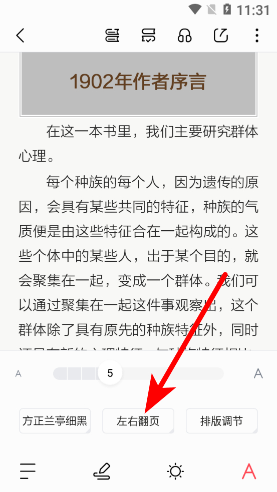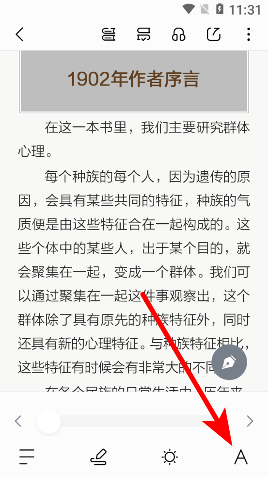 2、在書籍閱讀界面,點擊右下角A選項,展開設(shè)置菜單。