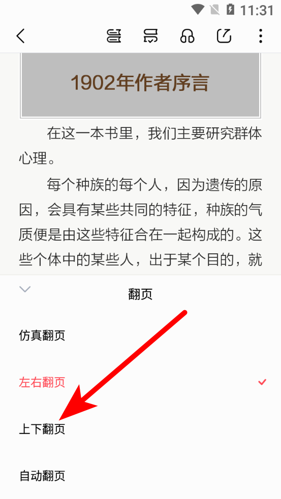 4、在翻頁設(shè)置頁面,點擊上下翻頁選項,即可完成翻頁方式設(shè)置。
