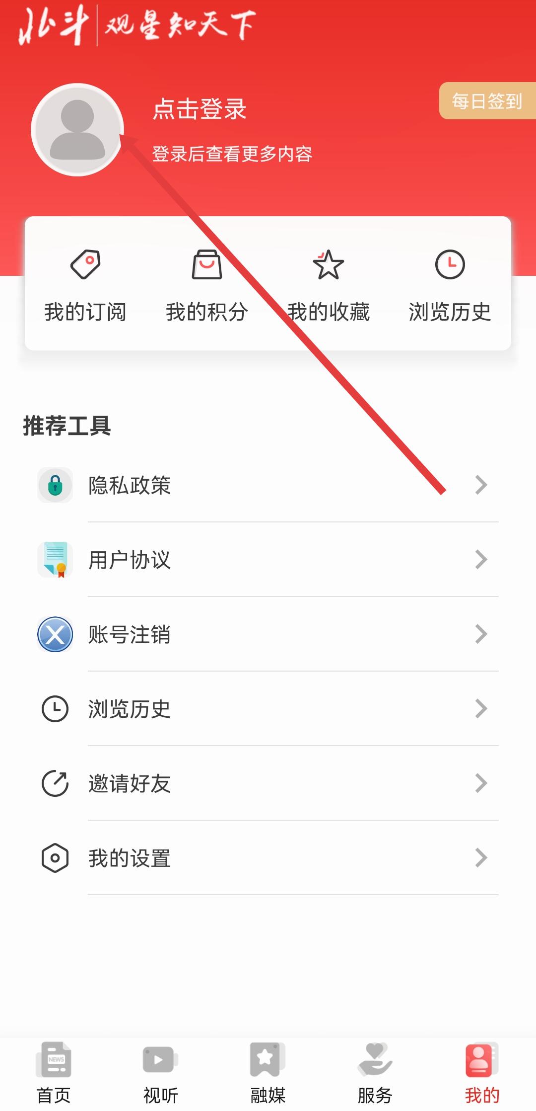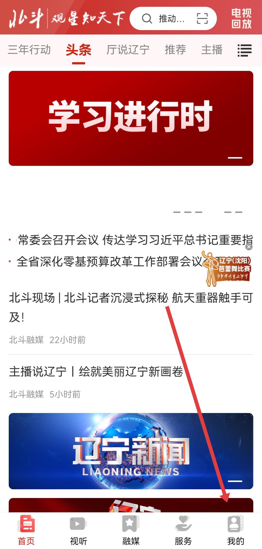 1、打開(kāi)北斗融媒APP,進(jìn)入app的首頁(yè)后需要點(diǎn)擊底部導(dǎo)航欄我的,進(jìn)入我的個(gè)人中心頁(yè)面。