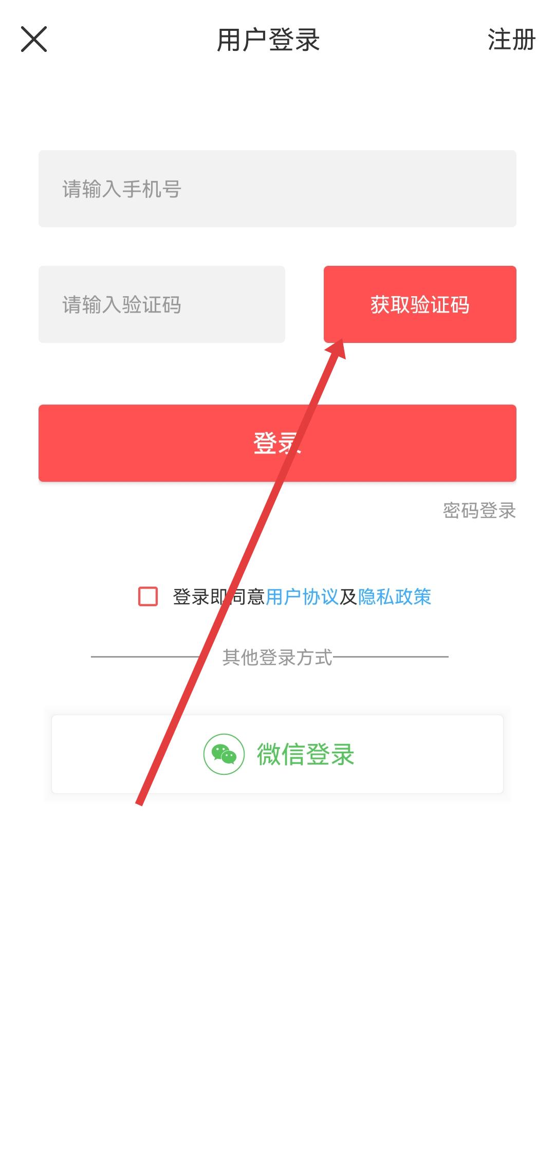 3、在登錄頁(yè)填寫手機(jī)號(hào)后,可以點(diǎn)擊獲取驗(yàn)證碼,接收驗(yàn)證碼完成登錄流程,也可以選擇用微信登入。