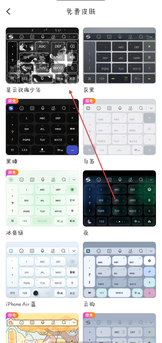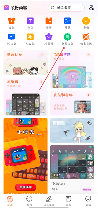 1、打開搜狗輸入法相關(guān)界面,在顯示裝扮商城的頁面中,找到并點(diǎn)擊免費(fèi)皮膚選項(xiàng),進(jìn)入免費(fèi)皮膚挑選頁面。