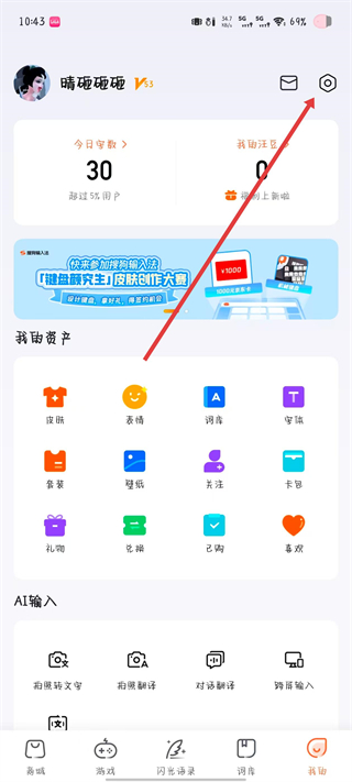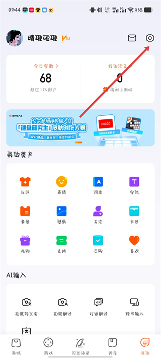 1、打開搜狗輸入法應(yīng)用,進(jìn)入我的頁面后,點(diǎn)擊設(shè)置圖標(biāo)。