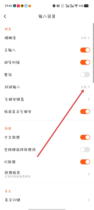 3、在輸入設(shè)置頁面,點(diǎn)擊雙拼輸入選項(xiàng)。