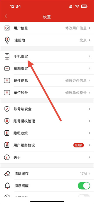 3、在設(shè)置頁面,點擊手機綁定選項,進入驗證手機號頁面。