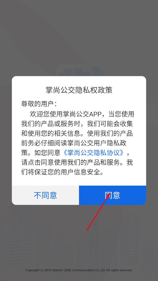 1、打開掌尚公交APP,彈出隱私權(quán)政策彈窗,閱讀內(nèi)容后點擊同意,進入軟件主界面。