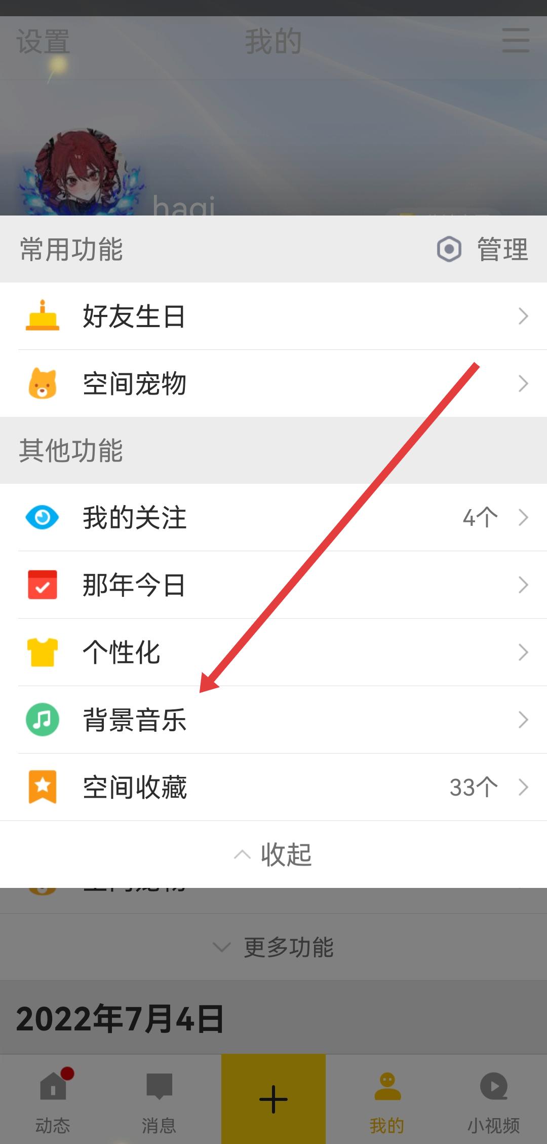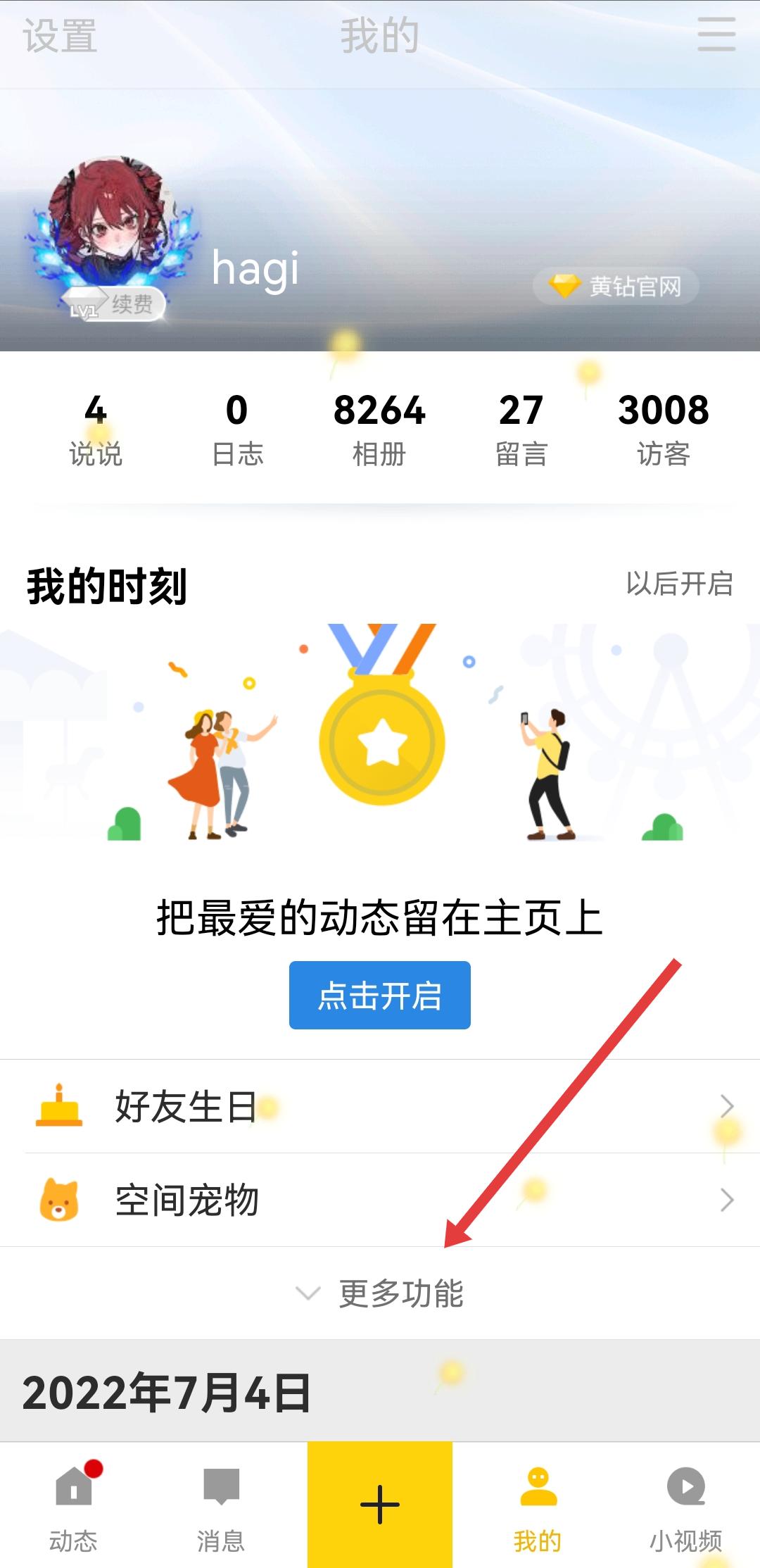 1、打開qq空間APP,進(jìn)入底部導(dǎo)航欄我的頁面后,需要點擊更多功能的選項。