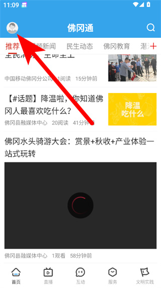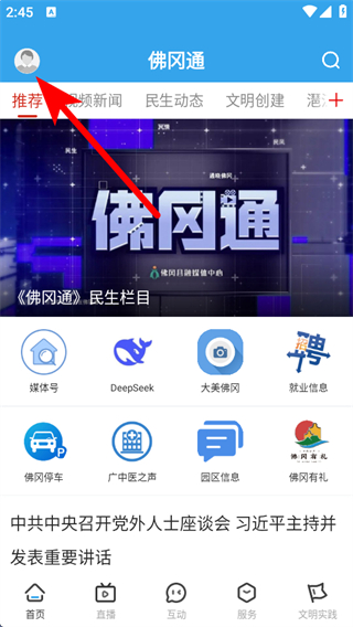 1、在佛岡通app首頁,點(diǎn)擊左上角頭像,進(jìn)入個(gè)人界面。