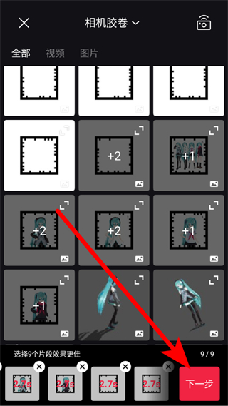 4、在圖片選擇頁(yè)面勾選需要的圖片,點(diǎn)擊下一步,即可按照模板生成視頻,完成暢片APP的使用操作。