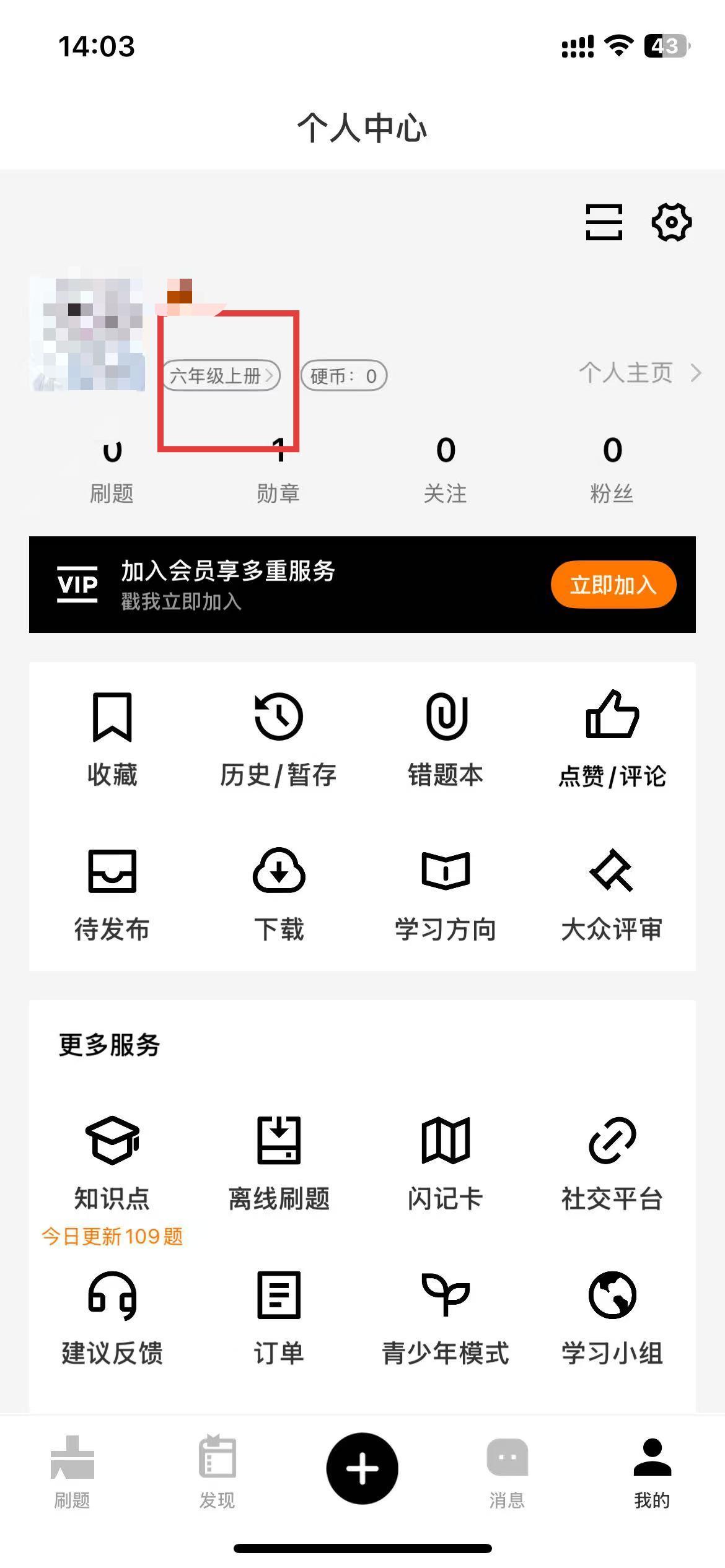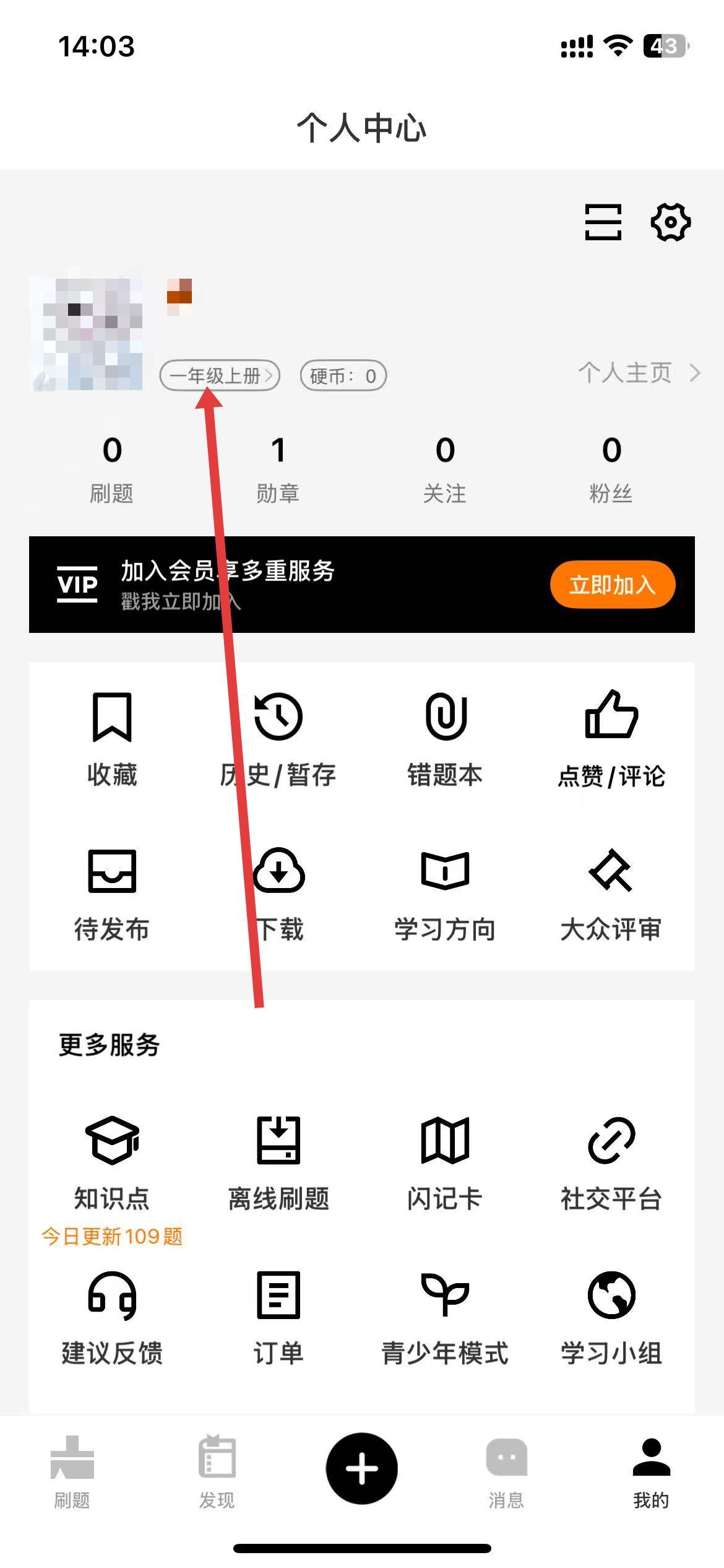 2、在個(gè)人中心頁(yè)面里,找到頭像下方顯示當(dāng)前年級(jí)的位置,點(diǎn)擊該位置 。