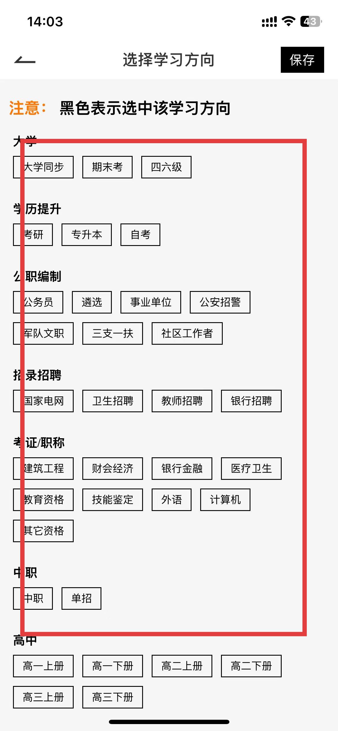 3、進(jìn)入選擇學(xué)習(xí)方向頁(yè)面,頁(yè)面中會(huì)展示多種學(xué)段和學(xué)習(xí)方向的選項(xiàng)。