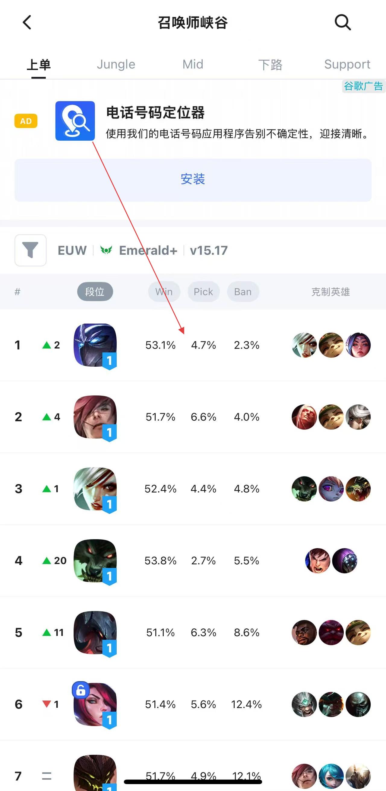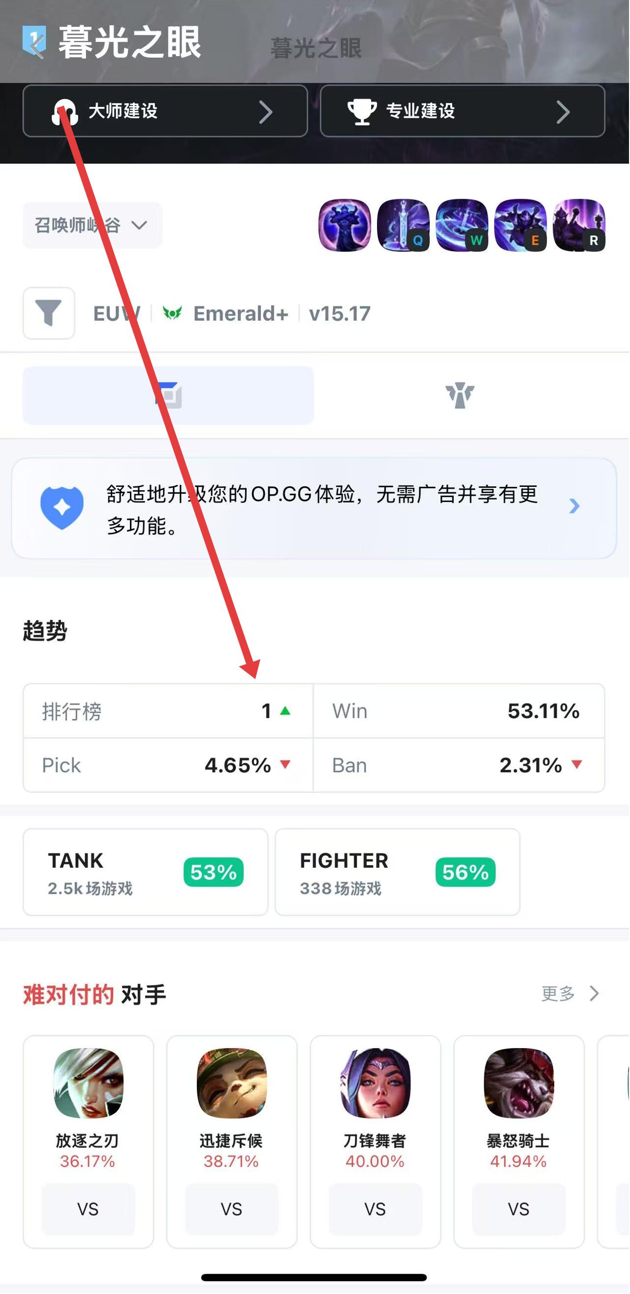 3、進(jìn)入英雄詳情頁(yè)后,能看到該英雄的排行榜、勝率等戰(zhàn)績(jī)相關(guān)數(shù)據(jù),下滑還可了解其面對(duì)不同對(duì)手時(shí)的勝率情況。