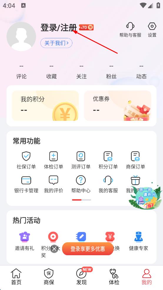 3、在個(gè)人頁(yè)面,點(diǎn)擊上方登錄/注冊(cè)按鈕,進(jìn)入用戶(hù)登錄界面。
