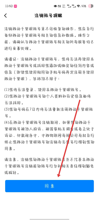 4、進(jìn)入注銷賬號(hào)提醒頁(yè)面,點(diǎn)擊底部的同意。