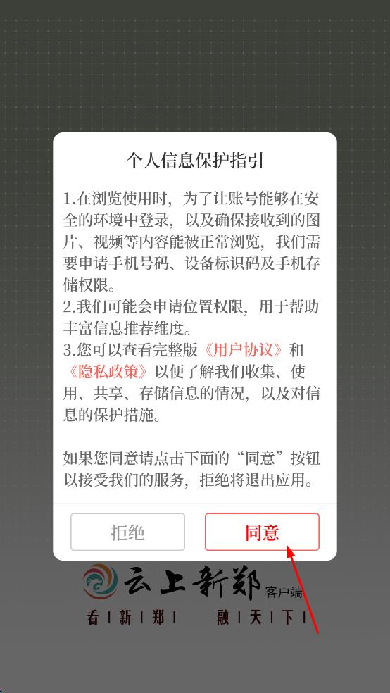 1、打開云上新鄭,在彈出的個人信息保護(hù)指引頁面,點擊同意,進(jìn)入云上新鄭首頁。