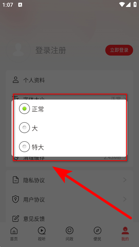 3、在選擇框中根據(jù)需求選擇正常、大或特大,完成字體大小設(shè)置。