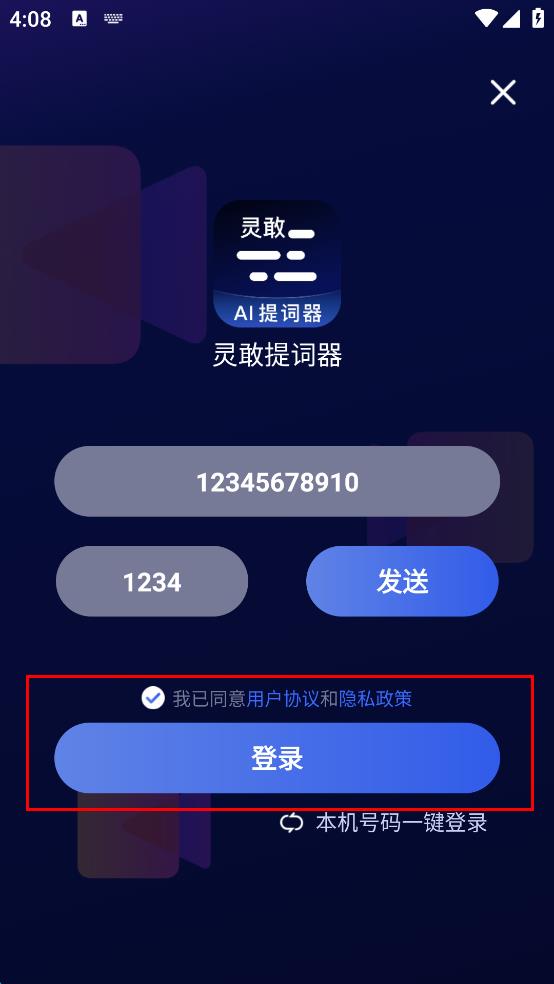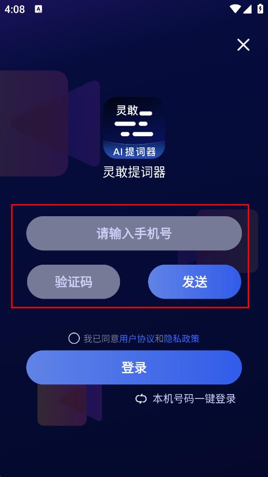 3、在登錄頁(yè)面,輸入手機(jī)號(hào)、驗(yàn)證碼,勾選同意用戶協(xié)議和隱私政策。