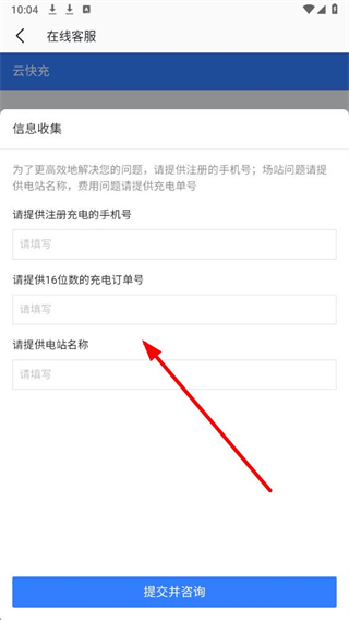 4、在在線客服頁面,填寫所需信息,點(diǎn)擊提交并咨詢,即可聯(lián)系到云快充的在線客服。