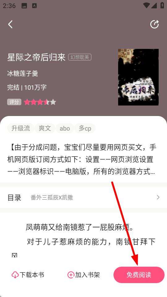 3、進(jìn)入星際之帝后歸來小說詳情頁面后,點(diǎn)擊免費(fèi)閱讀按鈕進(jìn)入閱讀界面。