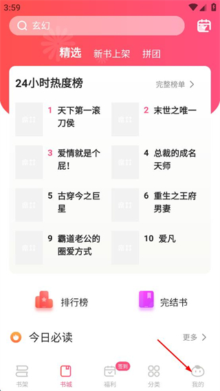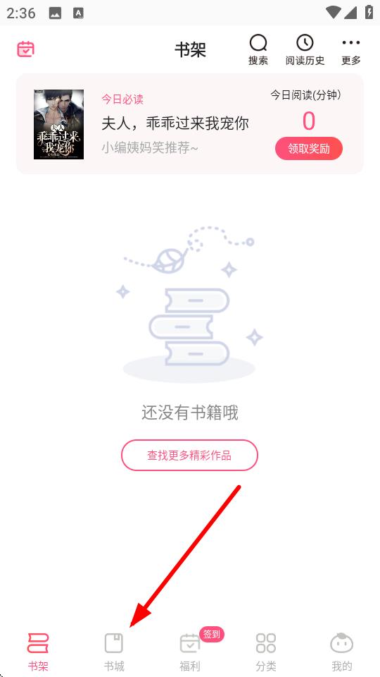 1、打開腐竹小說app,進(jìn)入書架頁面,點(diǎn)擊底部導(dǎo)航欄中的書城選項(xiàng)。