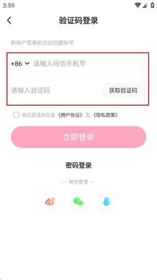 3、在登錄界面輸入手機(jī)號(hào)和驗(yàn)證碼。