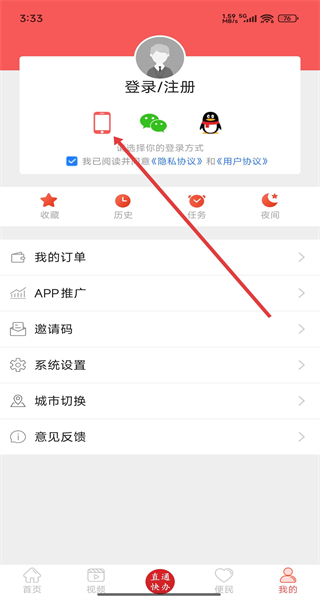 3、在個(gè)人中心界面,點(diǎn)擊手機(jī)圖標(biāo)對(duì)應(yīng)的登錄方式,進(jìn)入手機(jī)號(hào)登錄界面。