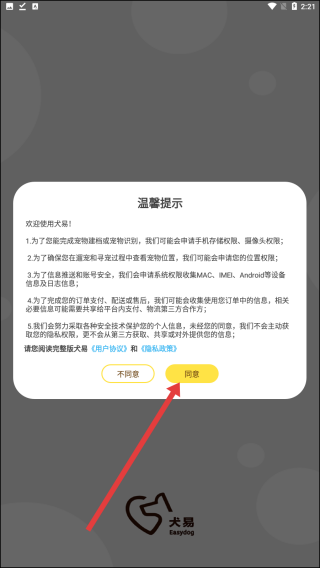 1、在溫馨提示彈窗中點(diǎn)擊同意按鈕,接受《用戶協(xié)議》和《隱私政策》,開(kāi)啟APP使用流程。