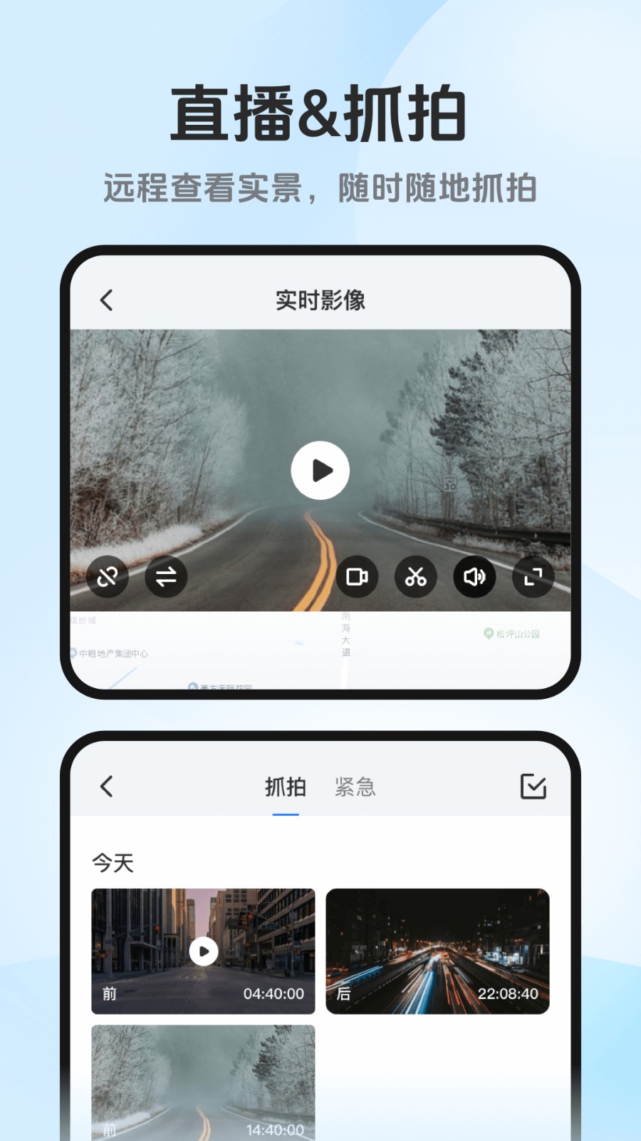 實景與抓拍:綁定記錄儀之后,如果記錄儀處于在線狀態(tài),可以查看遠程實景,并可以控制記錄儀進行抓拍