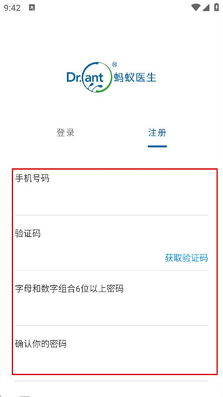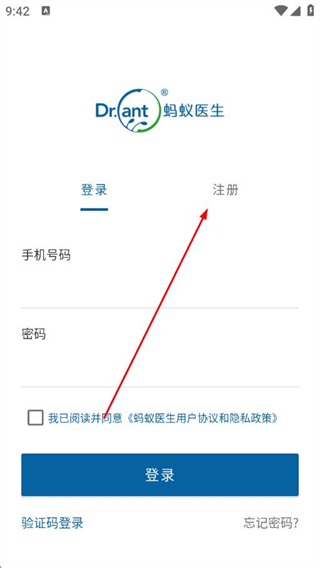 1、打開(kāi)螞蟻醫(yī)生APP,在登錄注冊(cè)頁(yè)面點(diǎn)擊注冊(cè)。