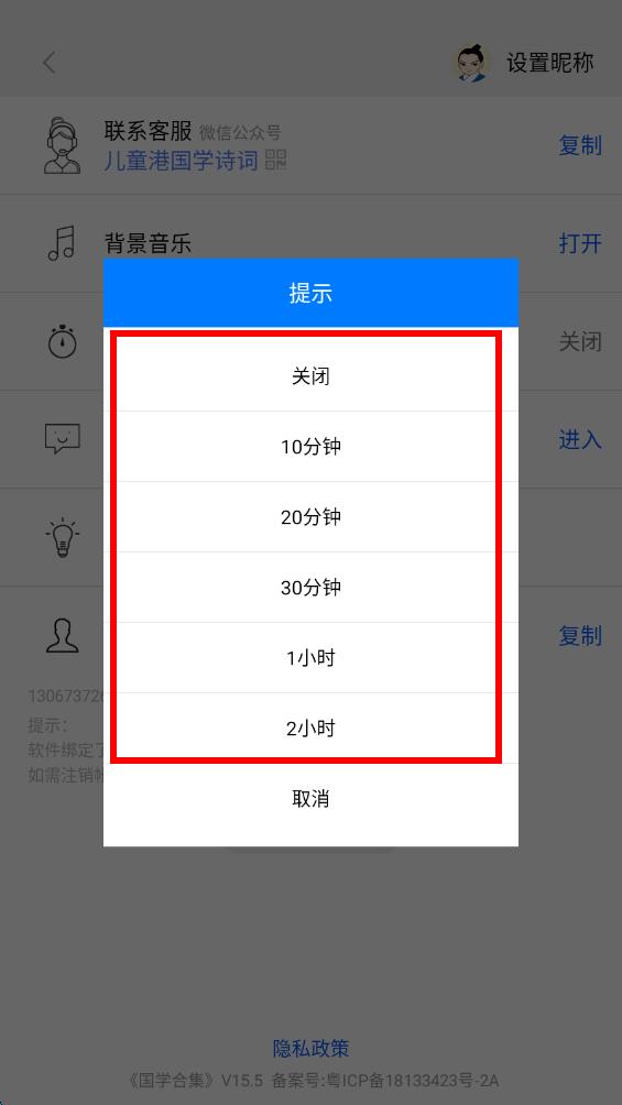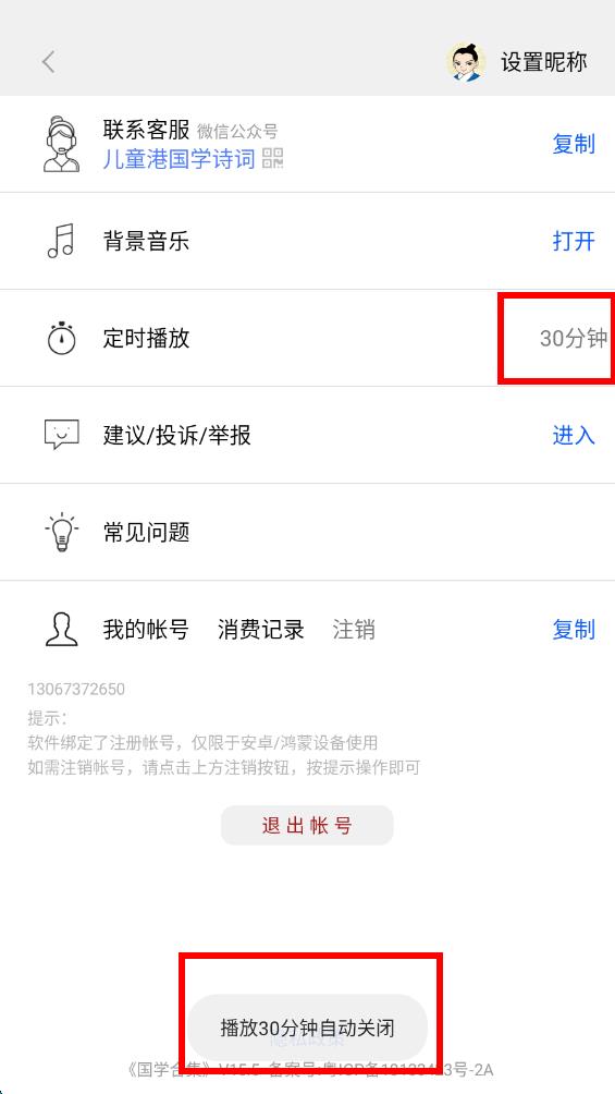 4、選擇好定時(shí)時(shí)長后,設(shè)置頁面可看到定時(shí)播放右側(cè)顯示所選時(shí)長,下方提示播放時(shí)間結(jié)束后關(guān)閉。