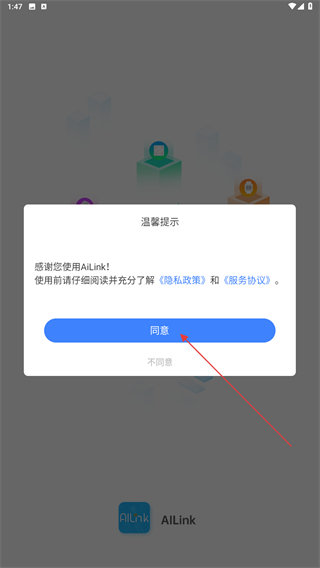 1、打開ailinkAPP,進入時會彈出溫馨提示,閱讀后點擊同意的按鈕。