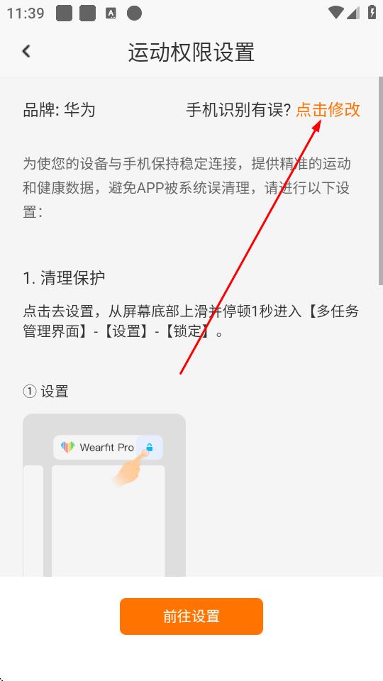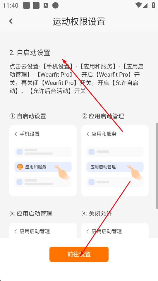 5、選擇好手機(jī)品牌后,頁面會(huì)顯示該品牌對應(yīng)的設(shè)置指引,了解自啟動(dòng)設(shè)置設(shè)置操作。點(diǎn)擊前往設(shè)置按鈕,完成操作。