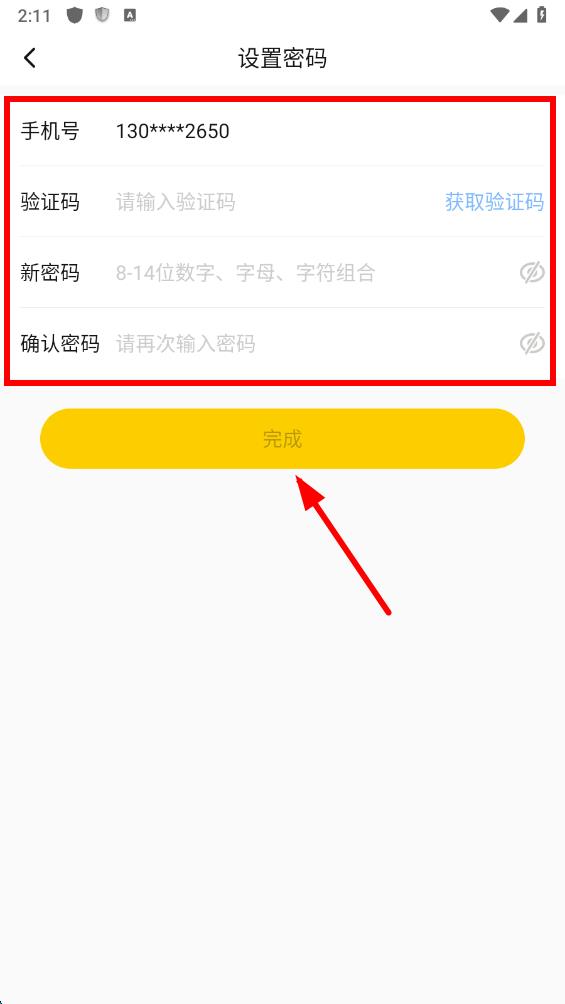 4、在設(shè)置密碼界面,獲取驗(yàn)證碼,設(shè)置新密碼,點(diǎn)擊完成,即可修改密碼。