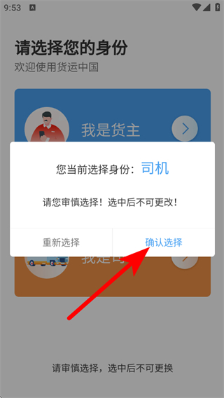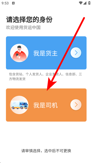 1、打開貨運(yùn)中國(guó)平臺(tái)app后,我們需要選擇對(duì)應(yīng)的身份。
