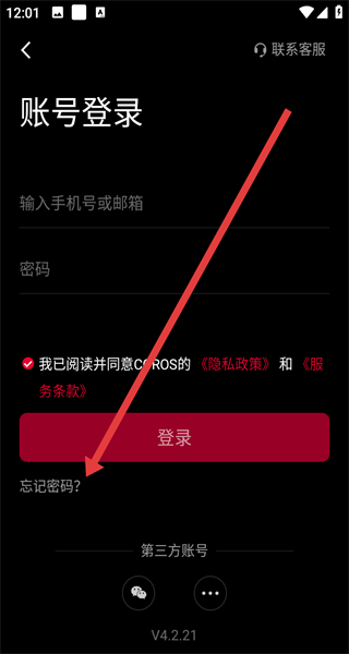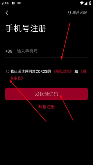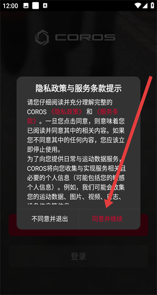 1、打開COROS APP,點(diǎn)擊同意并繼續(xù)按鈕,確認(rèn)隱私政策與服務(wù)條款,進(jìn)入登錄注冊(cè)界面。