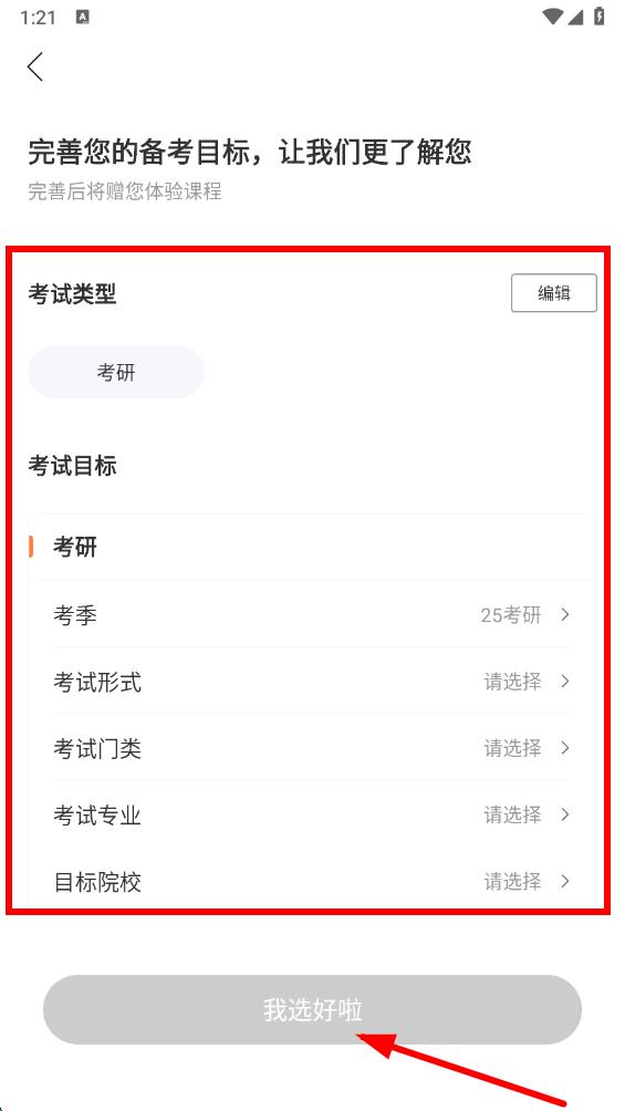 4、在備考意向界面,根據(jù)自身需求編輯考試類型、考季、考試形式等信息,確認(rèn)修改后點(diǎn)擊我選好啦完成備考意向信息修改。