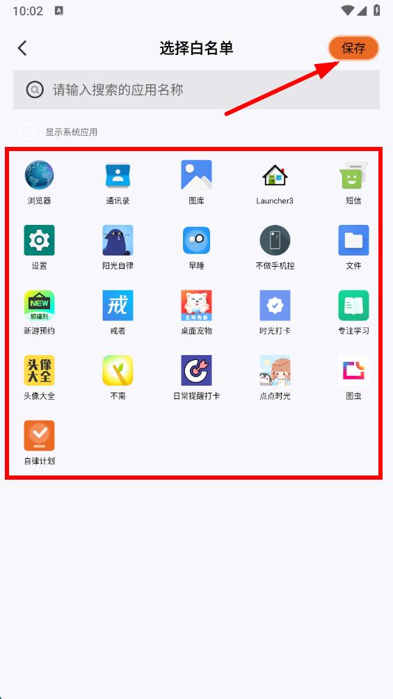 4、在選擇白名單頁面,根據(jù)個人需求點(diǎn)擊需要添加到白名單的應(yīng)用,點(diǎn)擊右上角保存,完成白名單設(shè)置。