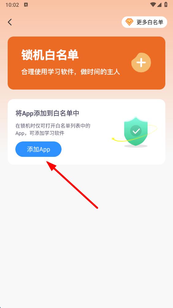 3、進(jìn)入鎖機(jī)白名單界面后,點(diǎn)擊添加App按鈕,進(jìn)入選擇應(yīng)用的頁面。