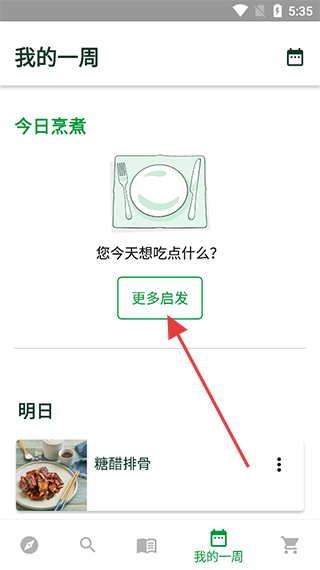 2、在我的一周頁面,若今日無菜譜可點(diǎn)擊更多啟發(fā)獲取菜譜靈感。